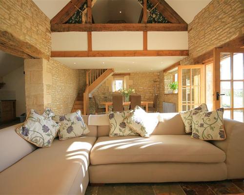 The Barn sits in perfect rural isolation surrounded by a paved terrace where you can sit and watch the sun set over the Cotswold hills. The garden is unfenced - and often pheasants will feed, hares box or deer graze right up to the front door!
